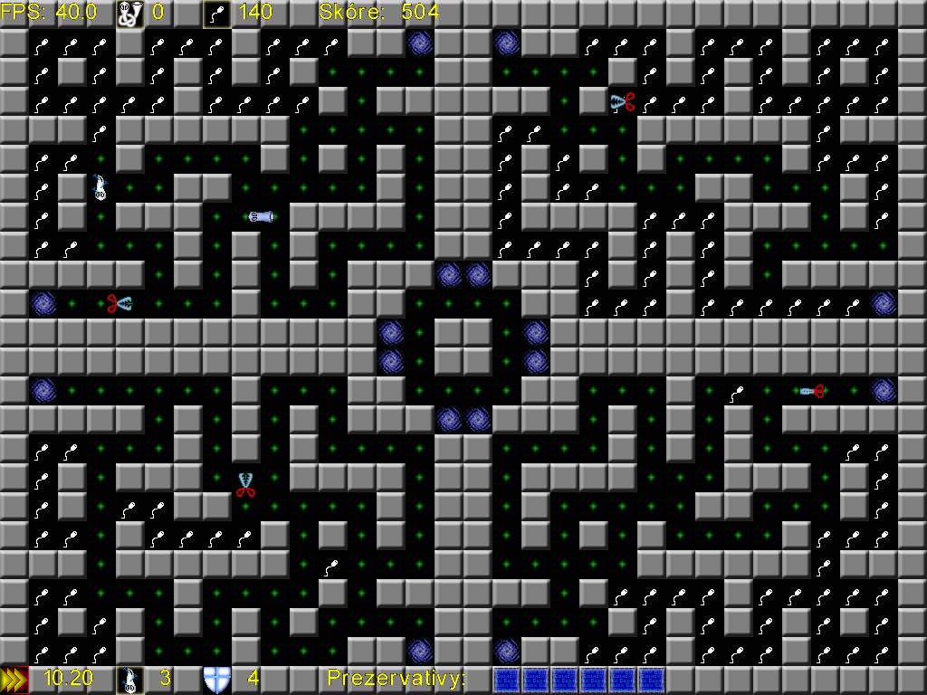 Toto je můj první pokus o nějakou hru, je to na ní bohužel vidět. Například beží jen v rozlišení 1024×768 s konstantním fps 40 - 50 (počet snímků za sekundu). Grafická stránka taky není nic moc, zvuková tam není vůbec :-), ale nejhorší je zdrojový kód - takovou prasárnu vám ani nepřeju vidět ;-)