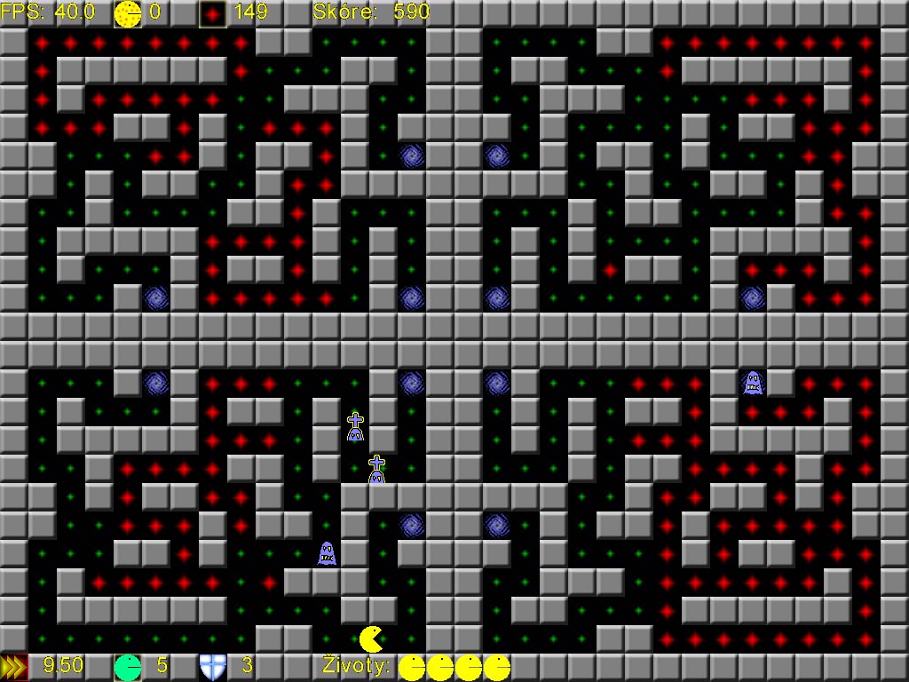 Proč jsem si vybral za námět právě PacMana? je to prosté - zrovna můj bratr hrál starýho Pampucha od Zoneru a protože mě pořád provokuje, řekl, že něco podobného nezvládnu naprogramovat. A tím mě vyburcoval k tomuto "výkonu". Aspoň, že mi pak pomoh udělat nějaký mapy a nakonec teda uznal, že něco málo umím :-)